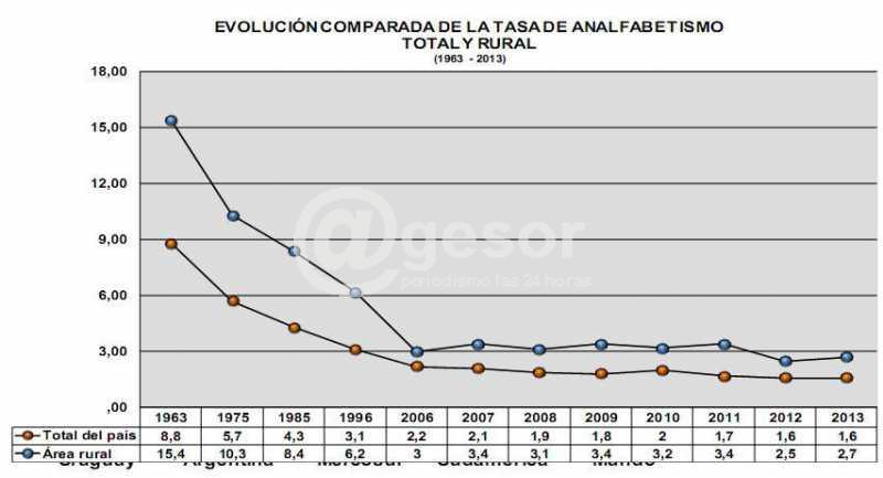 El informe elaborado por el Área de Investigación Estadística del MEC refleja una disminución lenta pero “constante y persistente” del analfabetismo en el Uruguay. “En los últimos 50 años, la tasa de analfabetismo se redujo a casi la sexta parte de la existente en 1963. En 1963: 8,8 %; y en 2013: 1,6 %”, expresa el informe. En tanto el analfabetismo rural pasó de 15,4% a 2,7% en le mismo período.