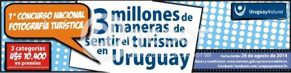El Ministerio de Turismo y Deporte, a través de la Dirección Nacional de Turismo, convoca a participar del primer concurso fotográfico “3 millones de maneras de sentir el turismo en Uruguay”. Su objetivo es mostrar al mundo la diversidad de paisajes del país y las experiencias que se pueden vivir, y de esta manera seguir posicionando a Uruguay como destino turístico. El concurso está abierto a fotógrafos aficionados y profesionales del país, mayores de 18 años. Comprende tres categorías temáticas: paisajes y atractivos turísticos patrimoniales; experiencias turísticas; y marcas de identidad de la cultura y el turismo en Uruguay. En cada una de las categorías se premiará a tres fotografías. Los primeros premios recibirán U$S 1000, los segundos U$S 500 y los terceros US$ 300, y a su vez, se mencionarán 50 fotografías más, que recibirán una partida de US$ 100 cada una.