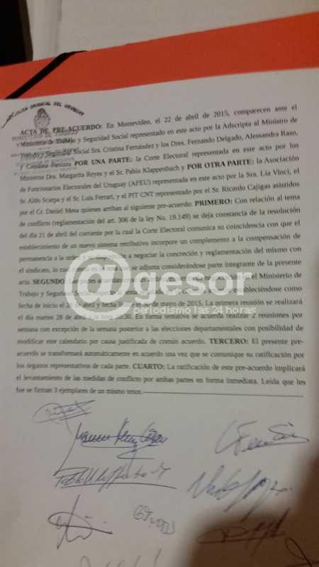 El resultado de la misma fue, la Corte Electoral aprueba cambiar el sistema de extensión horaria por complemento de permanencia a la orden. Aprobándose un cronograma de 2 reuniones semanales con finalización el 30 de mayo y estas reuniones se llevaran a cabo en el Ministerio de Trabajo.