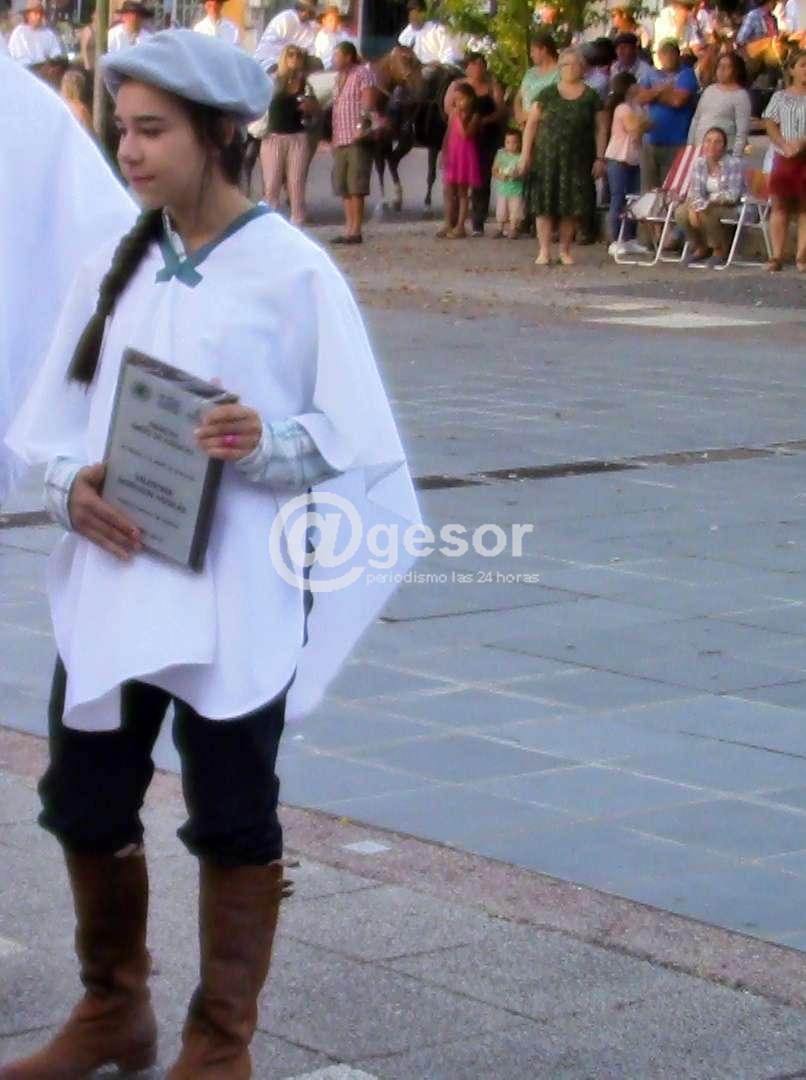Finalmente, en la plaza se procedió a entonarán estrofas del himno nacional uruguayo colocar una ofrenda floral al pie del monumento al gaucho, lo que estuvo a cargo del Sr. César Golly, en representación de la Asociación por Nuestros Hijos y de Williams Martínez en representación de la Aparcería el Cimarrón de Dolores. Una connotación especial que estuvo está marcha, fue la participación de una jovencita de 15 años de edad, ecuatoriana de nacimiento, llamada Valentina Arregin Aguilar que llegó a nuestro departamento para participar de esta marcha. Los integrantes de la Unión de Instituciones Tradicionalistas de Soriano Eugenia Cabrera, Mary Cabrera y Martin Hernández hicieron entrega de un presente.