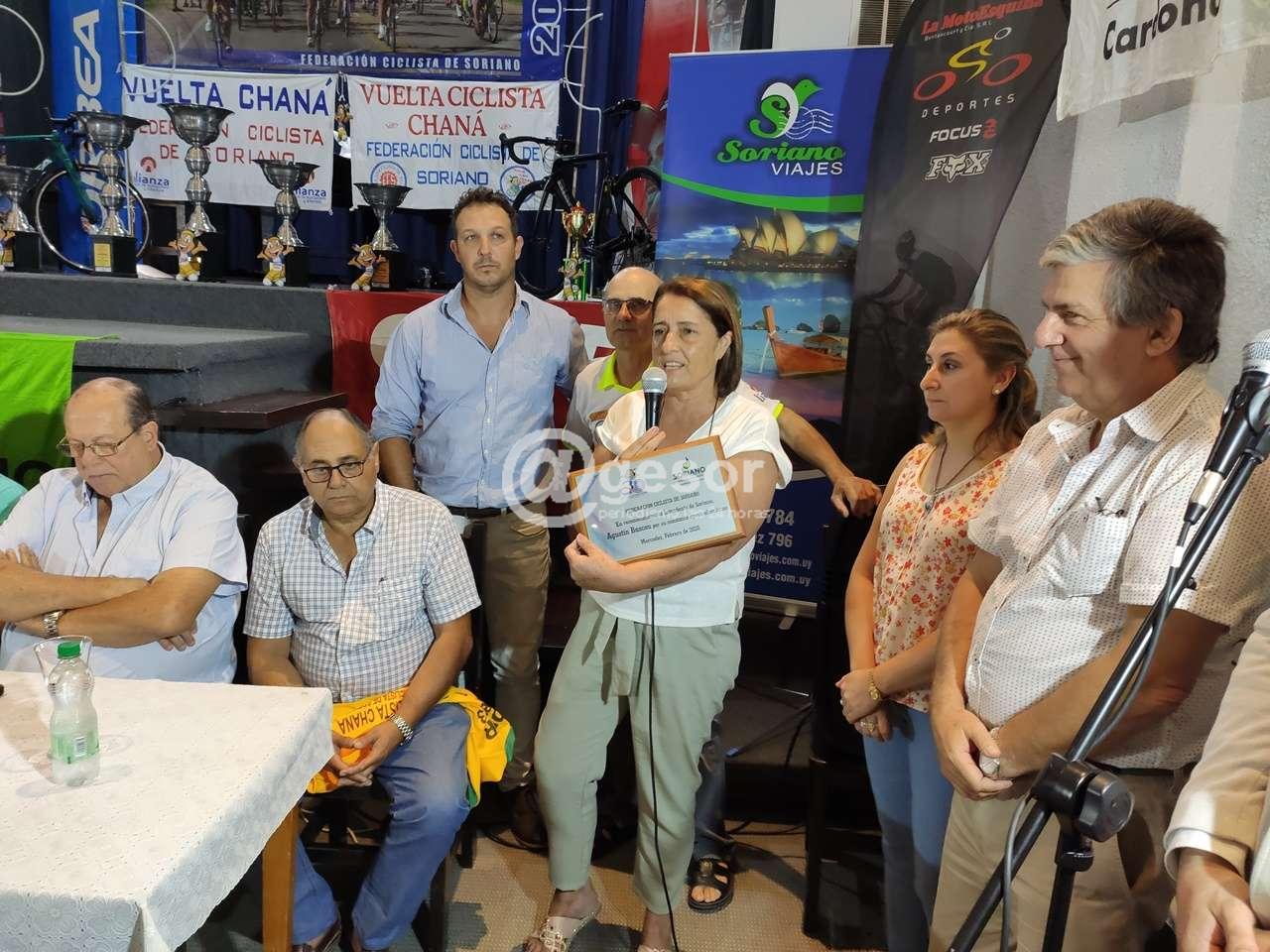 La Federación Ciclista de Soriano, hizo entrega de un reconocimiento a la Intendencia de Soriano en particular al intendente Agustín Bascou, por su apoyo a la vuelta y al ciclismo en general, recibiendo la Directora de Asuntos Sociales la Sra. María Fajardo, en compañía del Director de Turismo, José Perazza, el Director de Deportes y Recreación, Rodrigo Egui, y también la presidenta de la Junta Departamental de Soriano, Mayka Acuña.