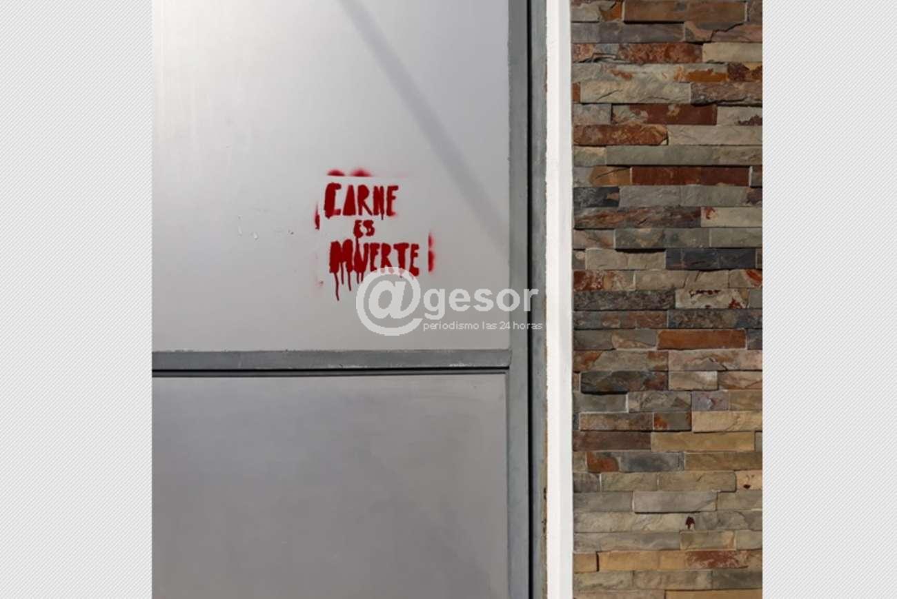 Allí se aprecian frases como "Liberación animal" en la vereda, "Carne es muerte" en una parte del exterior del local.