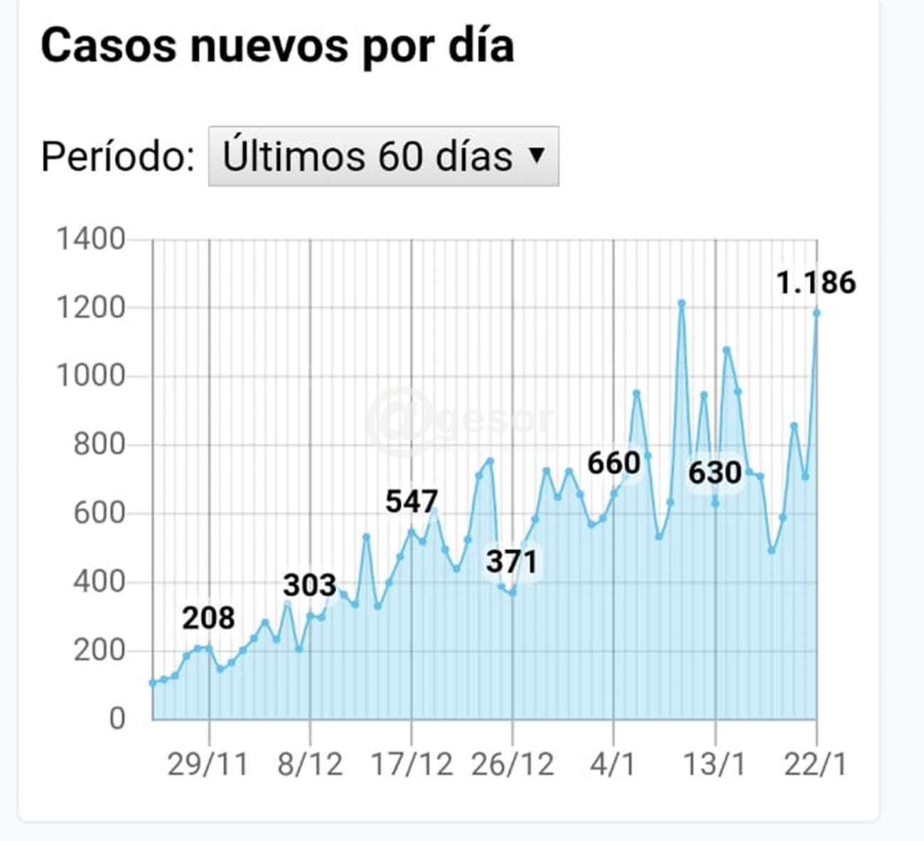 Con 64 casos activos Soriano volvió a ingresar en la zona naranja en el índice Harvard. Son 9 los departamentos en zona naranja: Artigas, Salto, Rocha, Maldonado, Lavalleja, Canelones, San José Durazno y Soriano. Montevideo, Rivera y Tacuarembó están en zona roja, en cuanto al nivel de contagios de Covid-19; y el resto del país en amarillo, ya que no hay departamentos en zona verde. Por lo que la situación es preocupante a nivel nacional. La evolución de los contagios experimenta un aumento pronunciado, como lo marca la gráfica que acompaña esta nota.