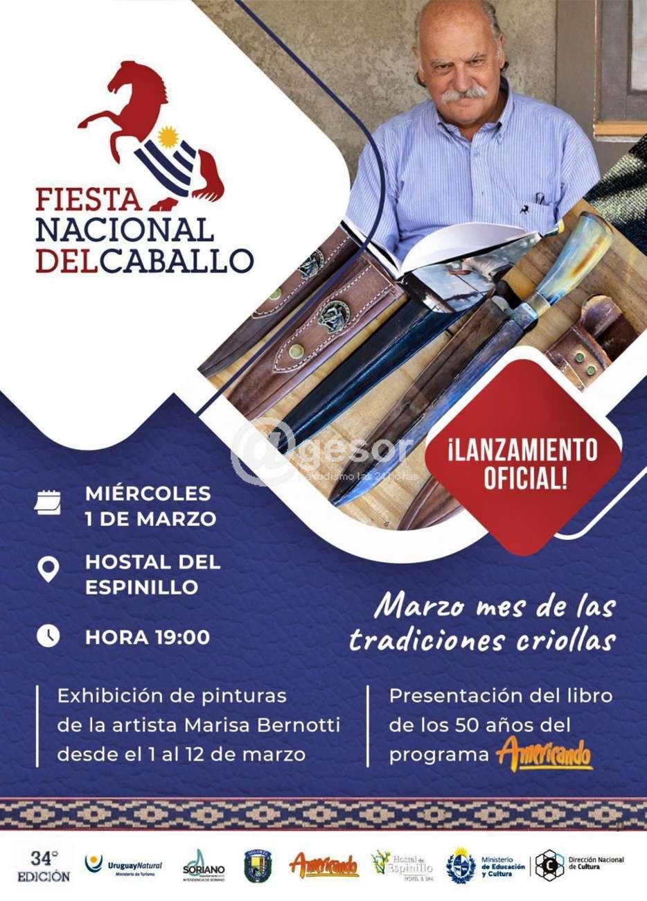 Este miércoles 1 de marzo en el Hostal del Espinillo desde las 19.00 horas se realizará el lanzamiento oficial de la 34ª Fiesta Nacional del Caballo, oportunidad en la que se podrá disfrutar de exhibición de pinturas de la artista Marisa Bernotti que se extenderá desde el 1 al 12 de marzo y la presentación del libro de los 50 años del programa Americando de Juan Carlos López, "Lopecito".