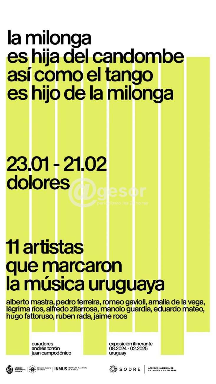 Desde el Municipio de Dolores están invitando a disfrutar de la muestra "La milonga es hija del candombe, así como el tango es hijo de la milonga", que permanece hasta el 21 de febrero en el Centro Cultural Nacional en calle Puig y Rico Puppo, de lunes a sábado de 7.00 a 13.00 horas.